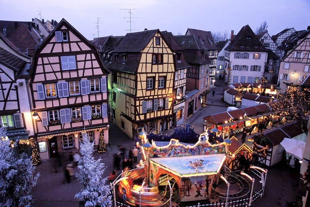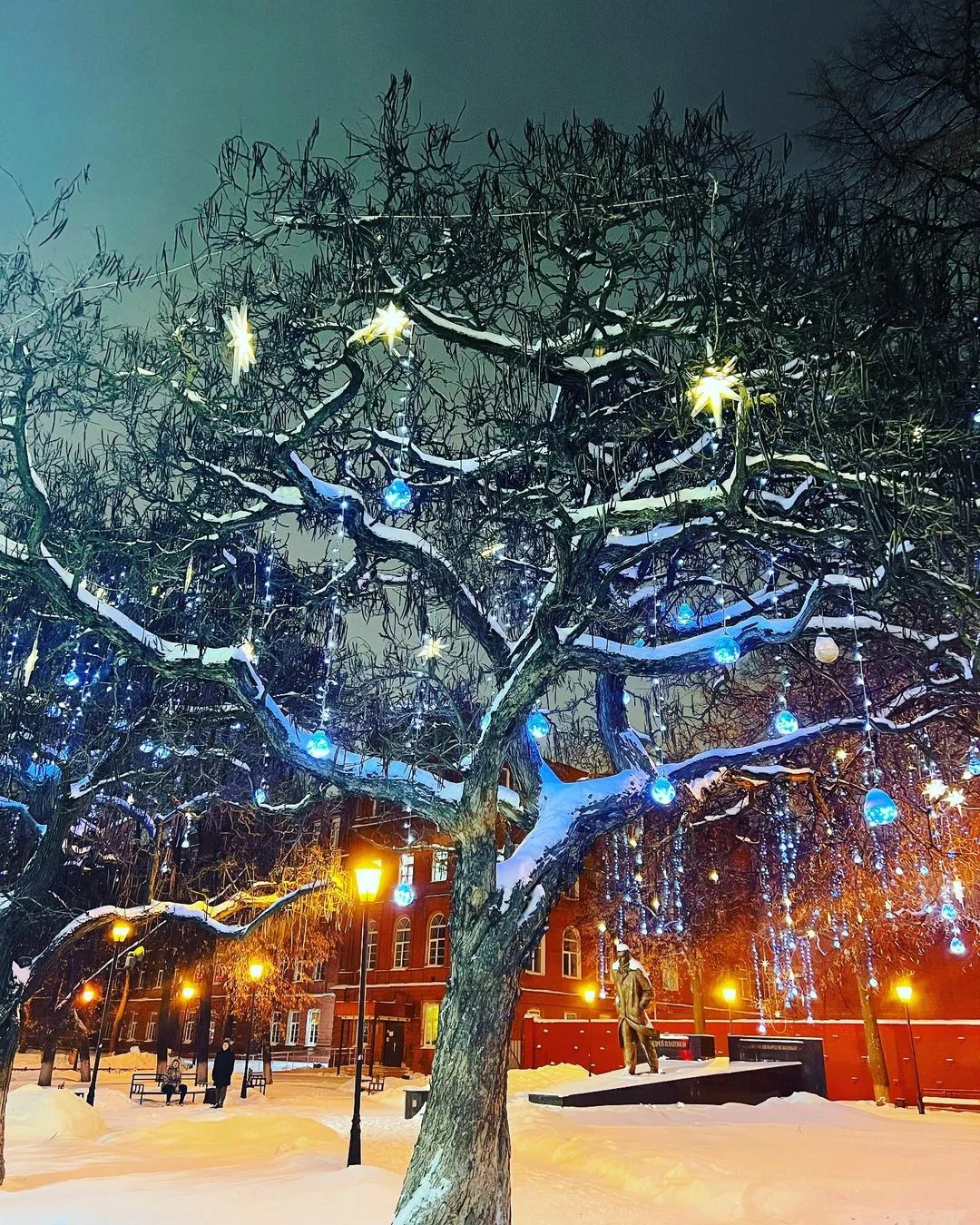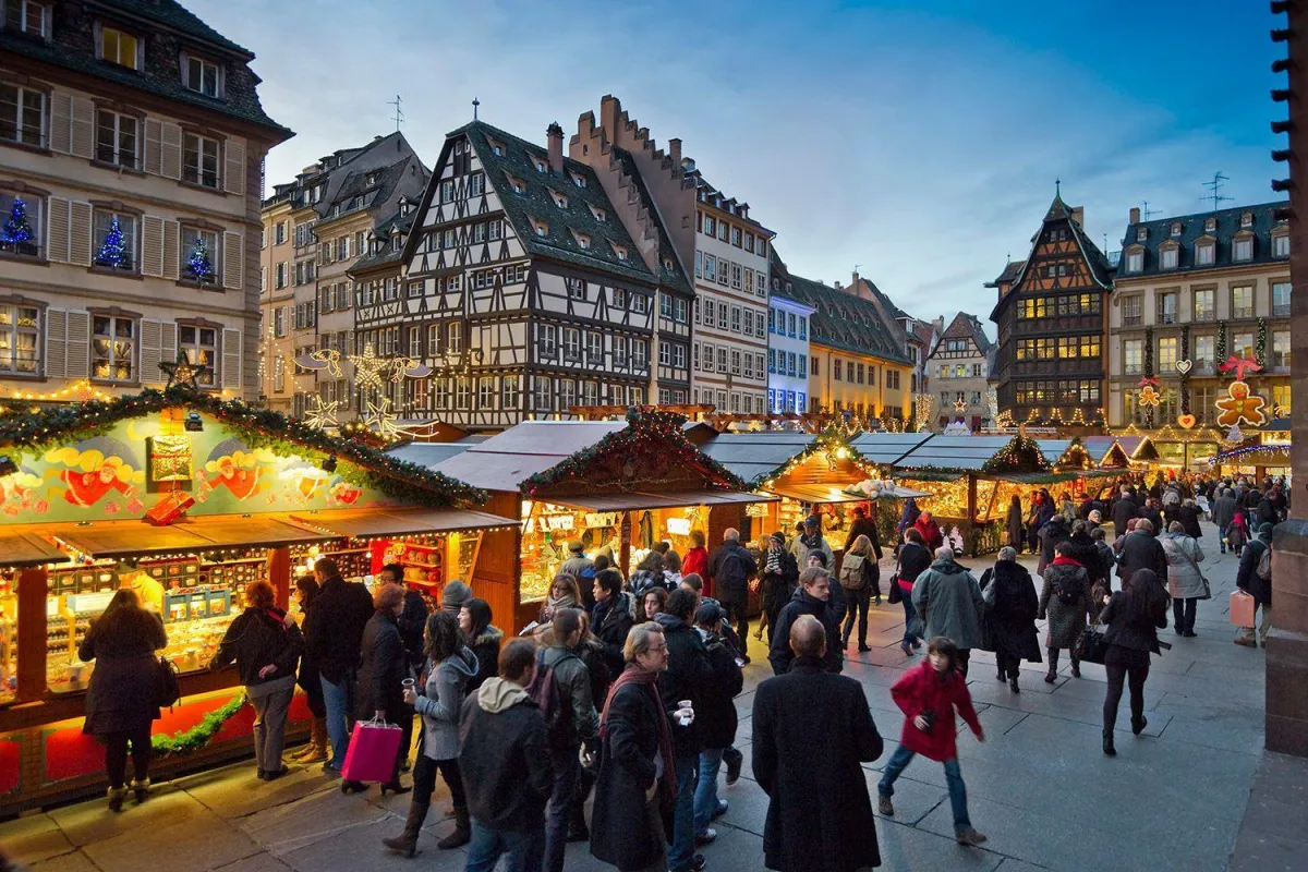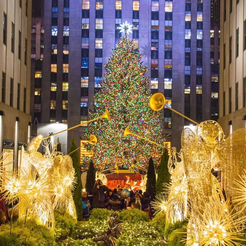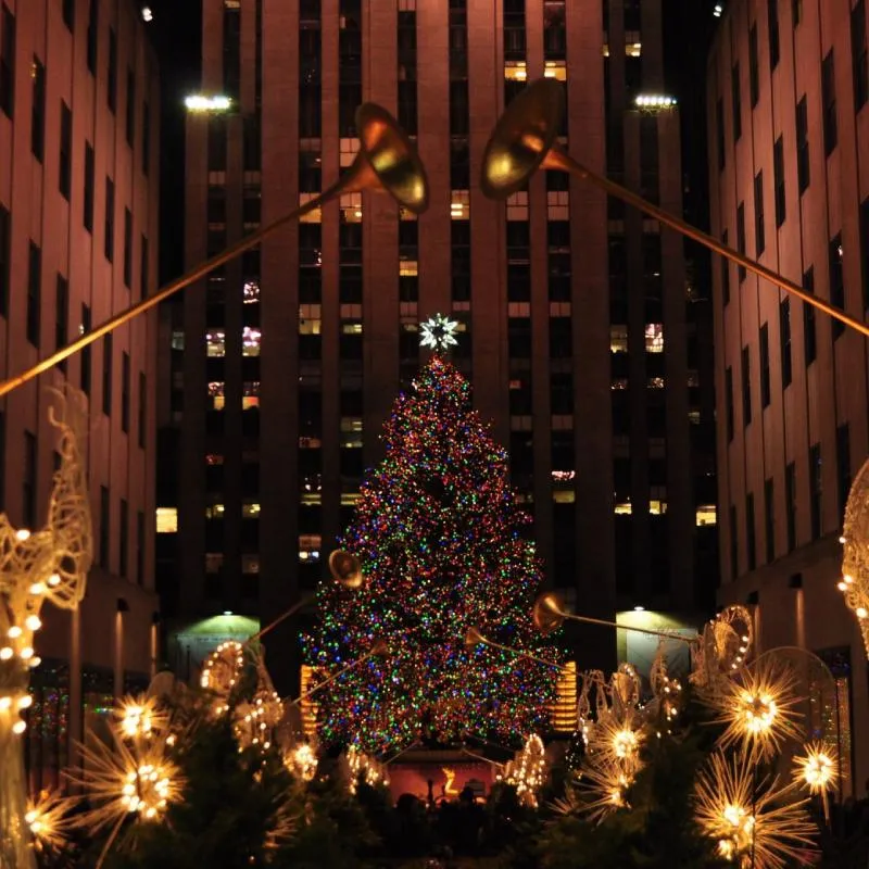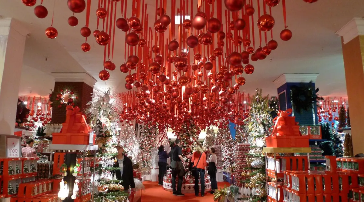 Large Christmas trees, lighted garlands, and festive banners that create central gathering points.